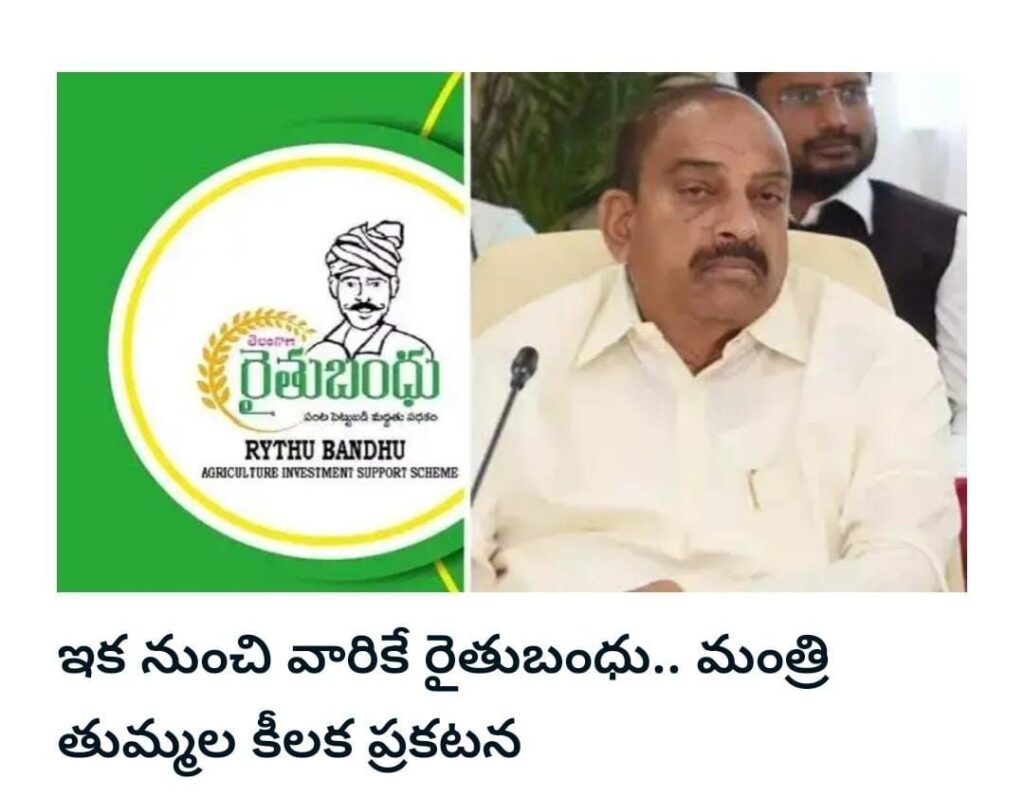 ఐదెకరాల మేర సాగుచేస్తున్న రైతులకు యాసంగి పెట్టుబడిగా రైతుబంధు ఇప్పటికే జమ చేశామని వ్యవసాయశాఖ మంత్రి తుమ్మల నాగేశ్వరరావు తెలిపారు.